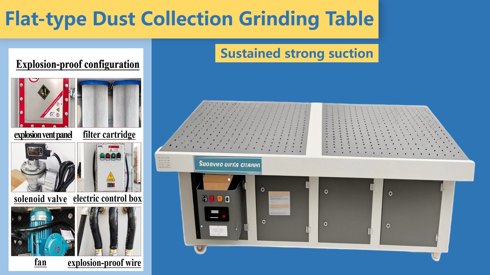 Environmentally friendly and efficient: The flat dust-absorbing sanding table can remove dust at the source of grinding, effectively control dust dispersion, and reduce dust pollution to the environment and harm to the health of operators.